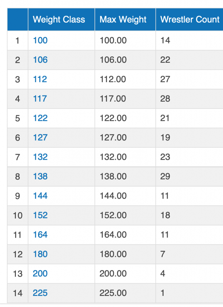 Wrestler count per weight class below for high school girls.