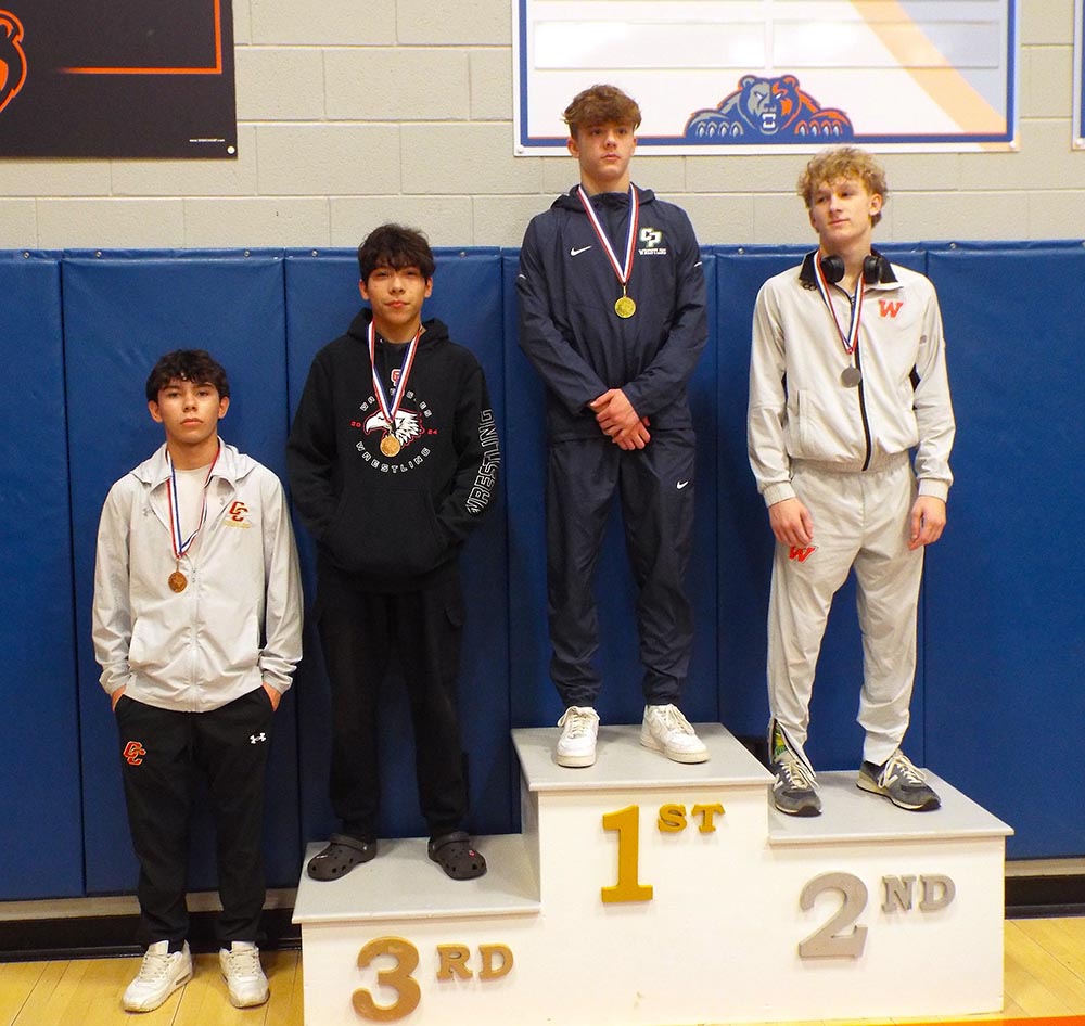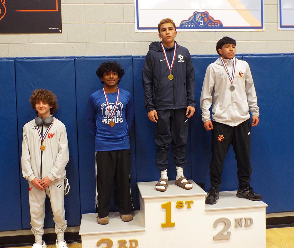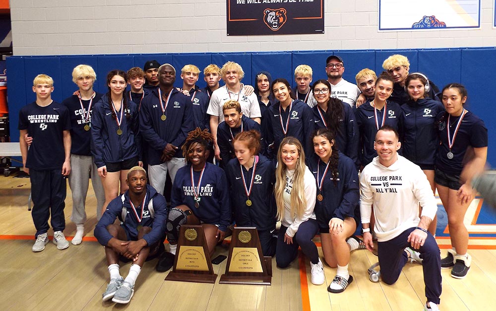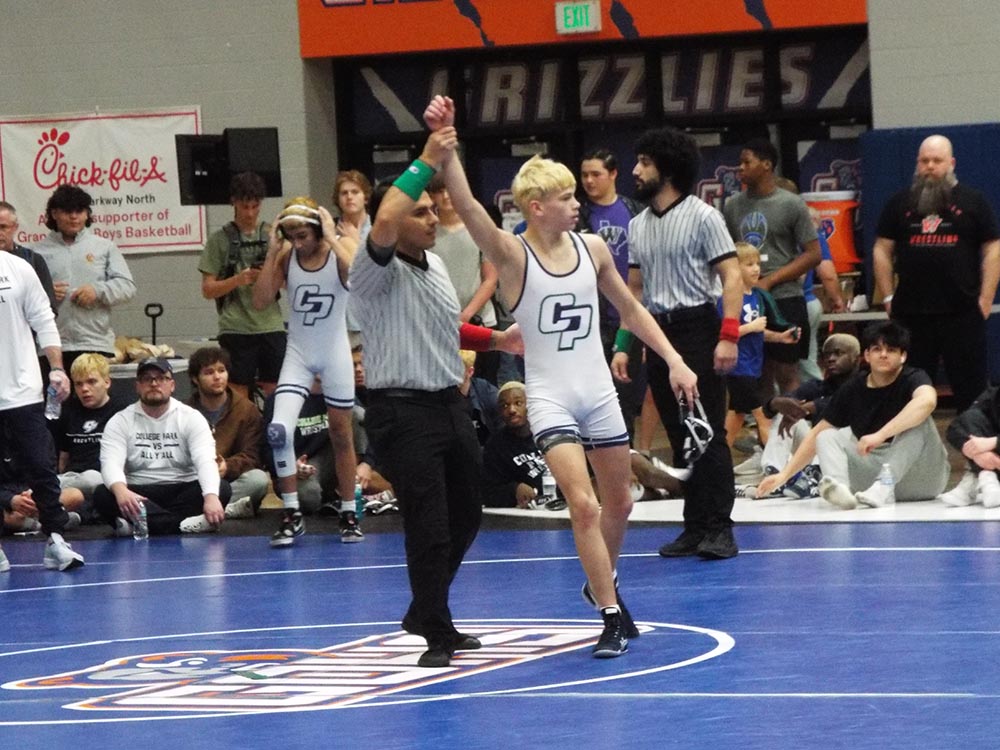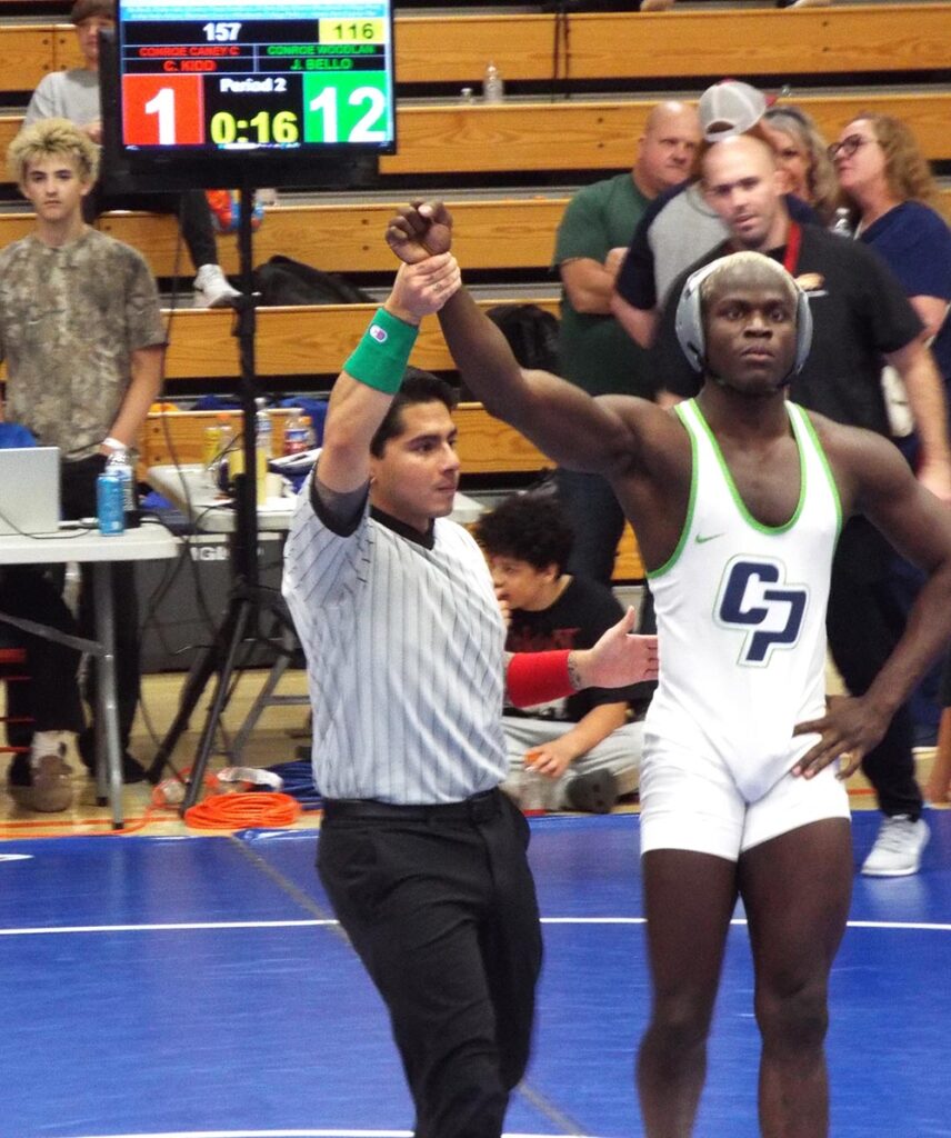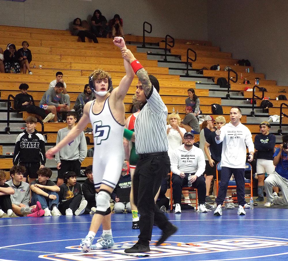 With only four wrestlers in the weight class, it would only take two wins to bring home the title, and thatās exactly what College Park ninth grader, Nick Payne (30-4) did. Payne ranked 5th in the State, secured his second 1st period pin in the finals against Brayden Spencer (18-12) of Conroe. Payne scored a double leg takedown in the first 0:30, and used an armbar tilt for a NF-4. He then ran the armbar to turn Spencer all the way over for the pin at 1:28.