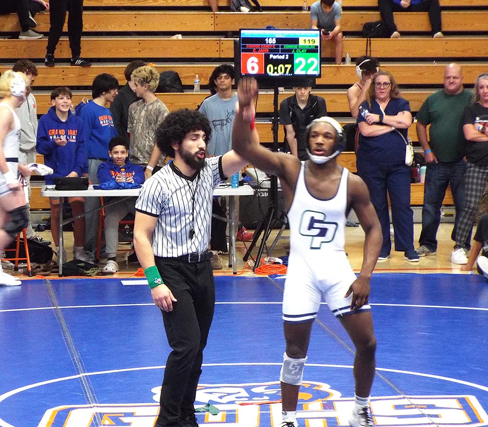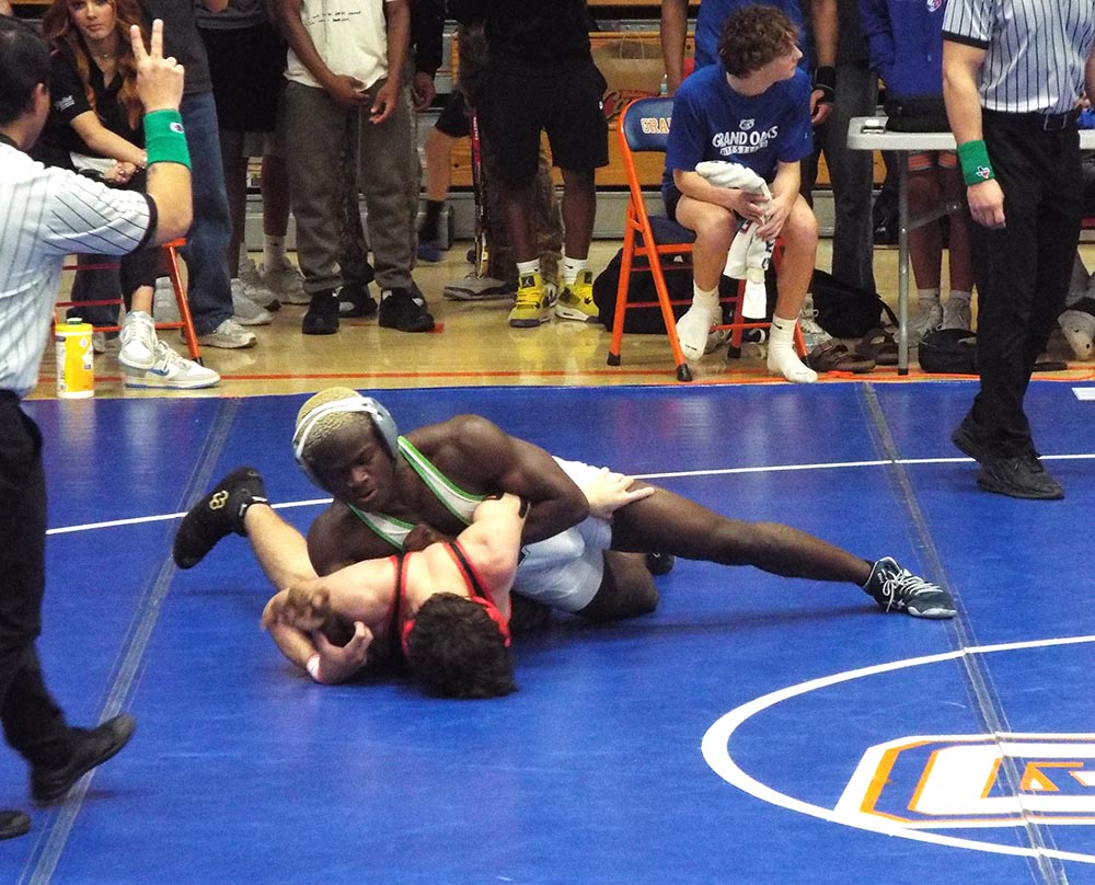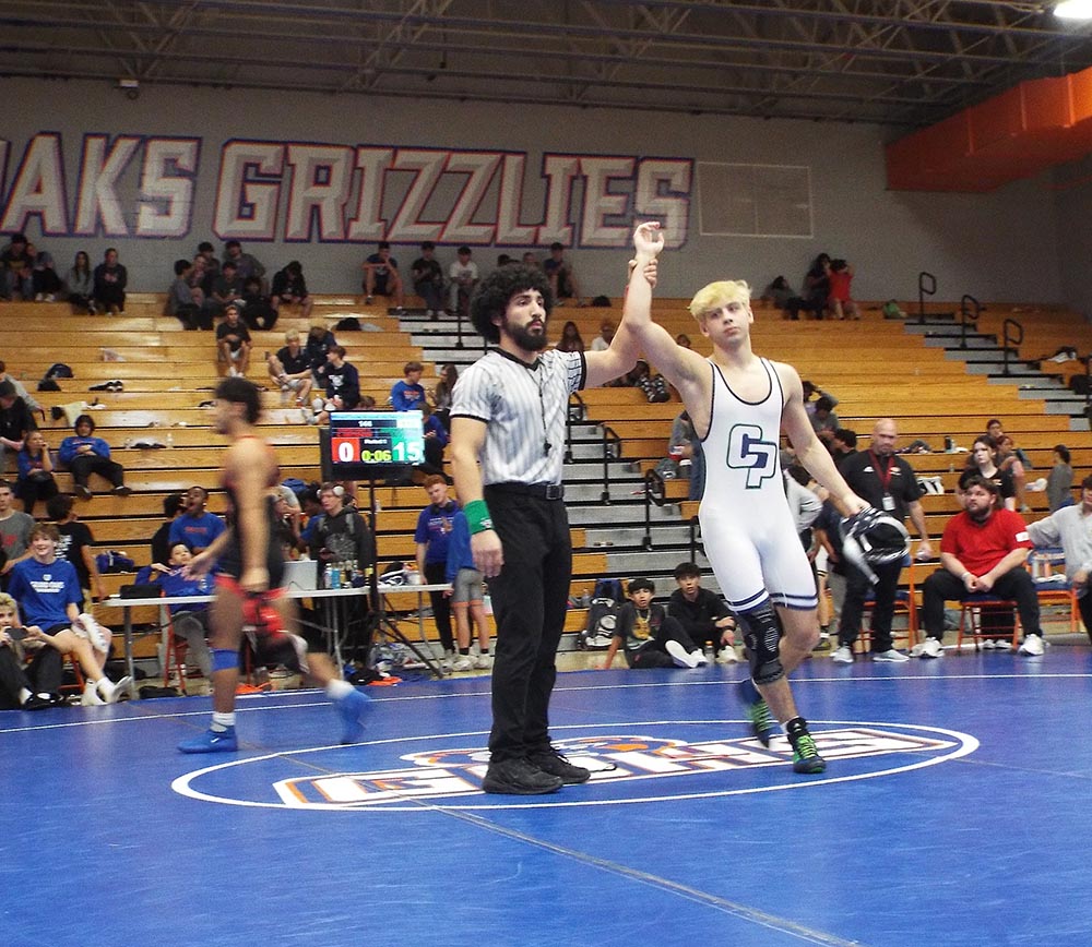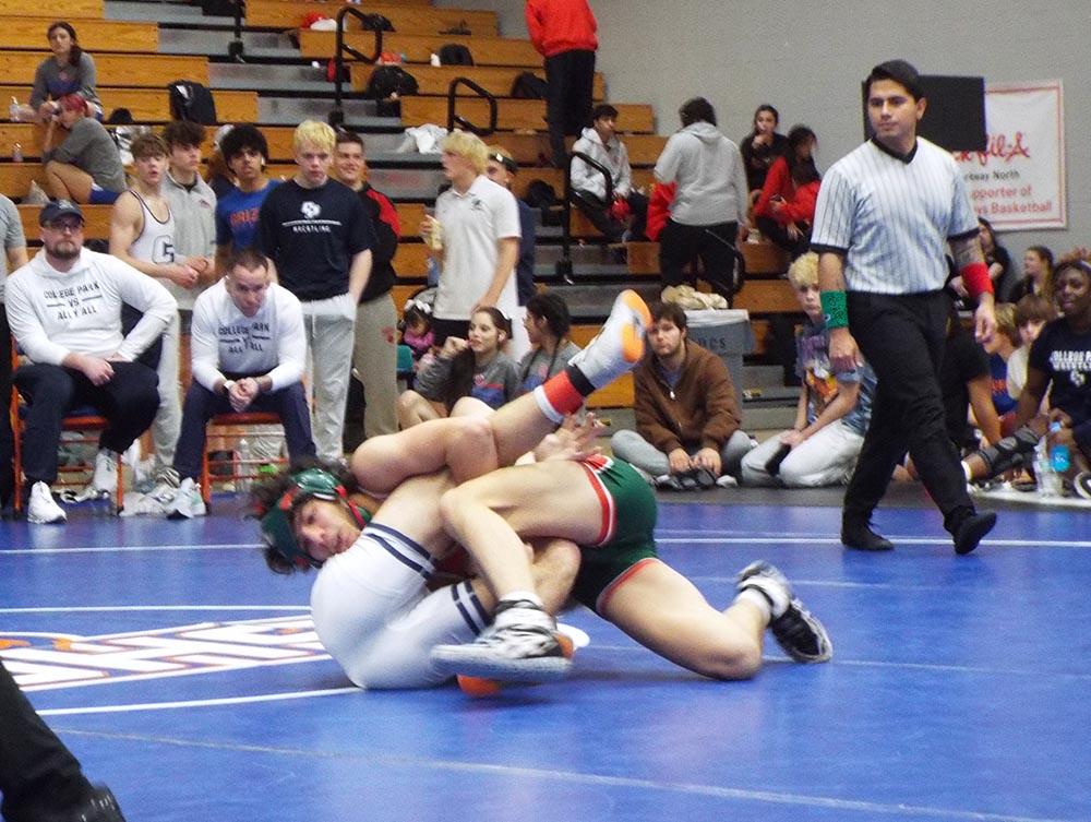#5 Luca Rios (25-6) of College Park and #11 (at 120 lbs.) Derrick Collins (19-1) of Oak Ridge came on the mat next. Rios was 4th place finisher last season as a freshman. Collins is a 2X UIL qualifier.