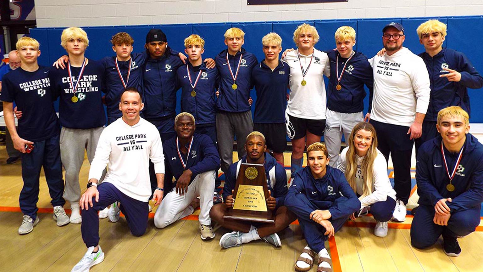 With only four wrestlers in the weight class, it would only take two wins to bring home the title, and thatās exactly what College Park ninth grader, Nick Payne (30-4) did. Payne ranked 5th in the State, secured his second 1st period pin in the finals against Brayden Spencer (18-12) of Conroe. Payne scored a double leg takedown in the first 0:30, and used an armbar tilt for a NF-4. He then ran the armbar to turn Spencer all the way over for the pin at 1:28.