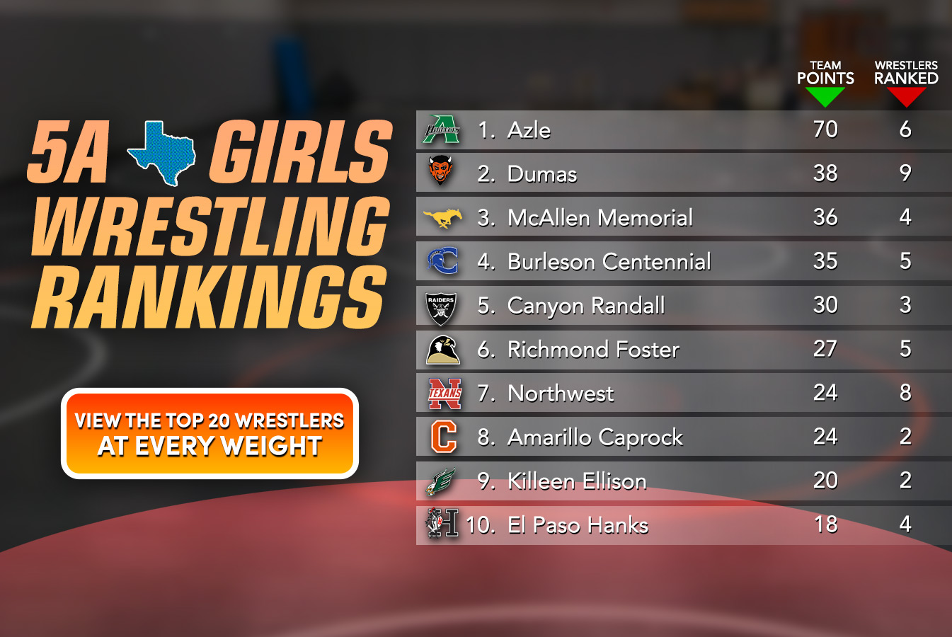 New season, new set of rankings. WrestlingTexas dives into the top 20 at each weight class and rank over 100+ teams based off these individual ranking placement to deter a tournament team ranking.